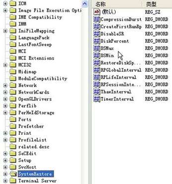 默认情况下Windows XP的用于“系统还原”的空间最大为12%,但可以通过修改注册表来更该这个值。运行注册表编辑器,后依次展开 HKEY_LOCAL_MACHINE\SOFTWARE\Microsoft\WindowsNT\CurrentVersion \SystemRestore分支,在右侧窗口中可以看见两个DWORD值“DSMax”和“DSMin”(图10),分别代表系统还原的最大和最小磁盘空间,直接修改它们的键值即可。该分支下还有一个名为“DiskPercent”的DWORD值,它表示要为系统还原分配的磁盘空间百分比,默认值为 12%,我们可以根据需要对其适当调整。